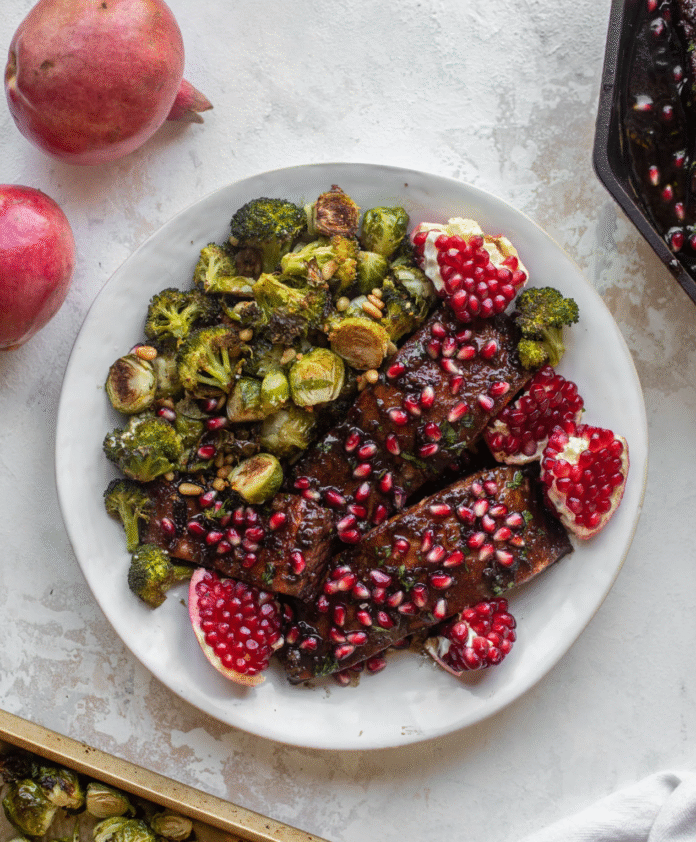 If you’re looking for a weeknight meal that feels both elegant and comforting, this sticky pomegranate salmon delivers. The salmon is coated in a rich maple-pomegranate glaze, yielding a tender, buttery texture. Paired with parmesan-roasted broccoli and Brussels sprouts, it becomes a full, satisfying dinner that feels special without requiring hours in the kitchen.